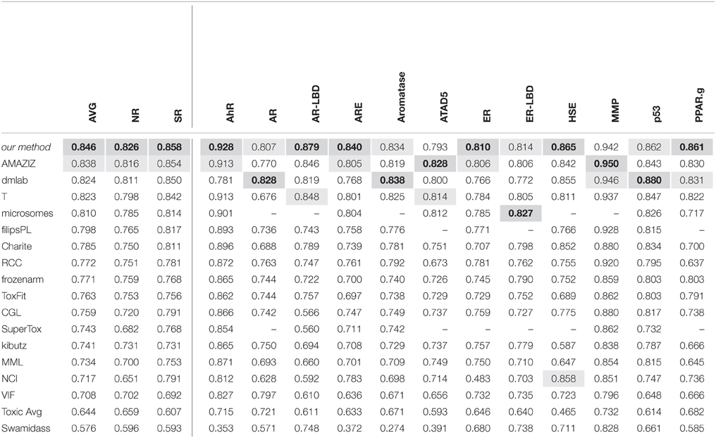 ![]() Performance of methods in terms of AUC. This table reports the performance of methods that participated in the Tox21 Data Challenge in terms of area under ROC curve. The first row, "our method", displays the performance of the Deep Learning method "DeepTox". For details see [Mayr2016]. |
